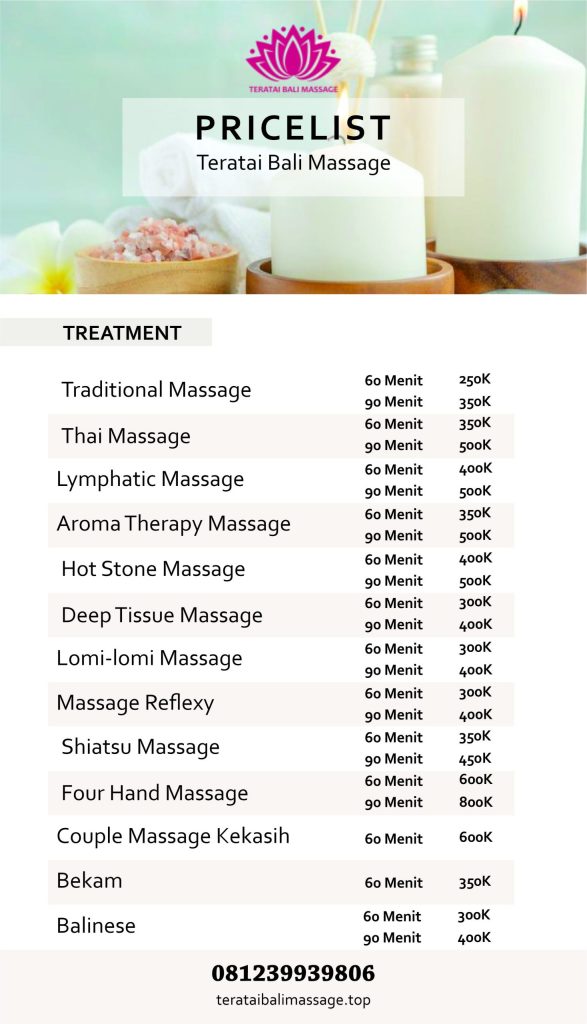 Berikut ini adalah paket massage kami. Hubungi kami untuk mendapatkan informasi lebih lanjut.